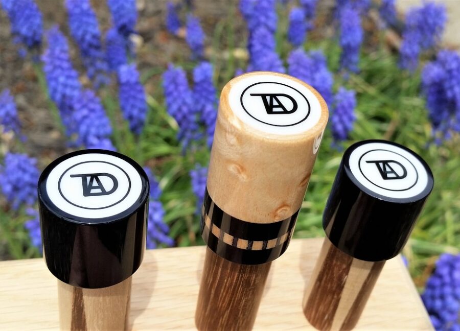 Here’s a great looking set of TAD joint protectors with the TAD logo and 20 dash stitch ring in the butt piece. The butt piece also boasts beautiful Birdseye Maple….